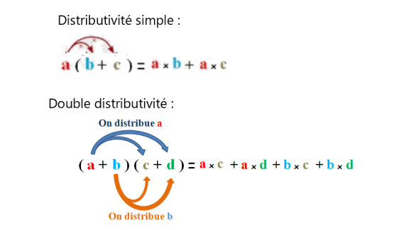 Pour développer : - distribuer le facteur en commun (avec la distributivité simple ou double) - reconnaître et utiliser une identité remarquable $ (a-b)^2=a^2-2ab+b^2 $ ou $ (a+b)^2=a^2+2ab+b^2 $